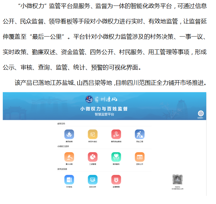 紀檢監督是公司深耕的核心領域,從產品開發到市場推廣都具有豐富經驗,一是打造了“紀委書記盯糧倉”“小微權力監督管理平臺”“清風百姓監督平臺”等紀檢產品;二是與“廉政瞭望”雜志簽訂了戰略合作協議,強強聯合,深入運用大數據技術,為各級黨政機關和紀檢監察系統提供定制化、信息化、智能化的監督執紀解決方案,助力實現廉政治理體系和治理能力現代化。